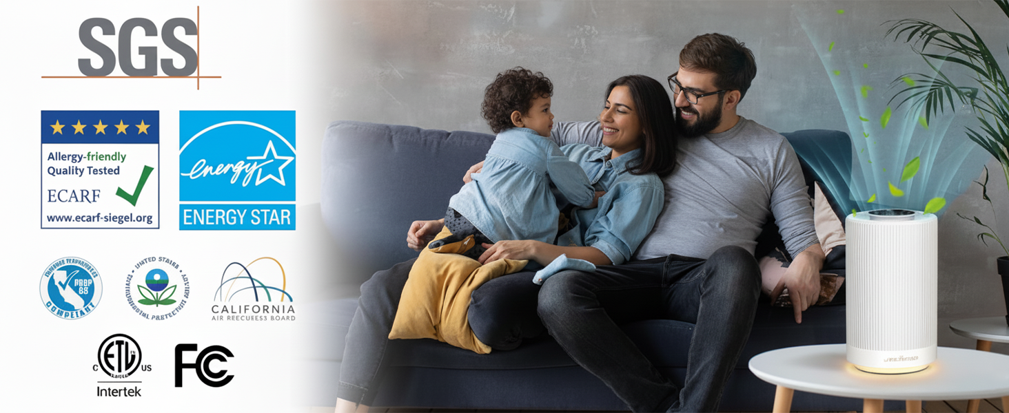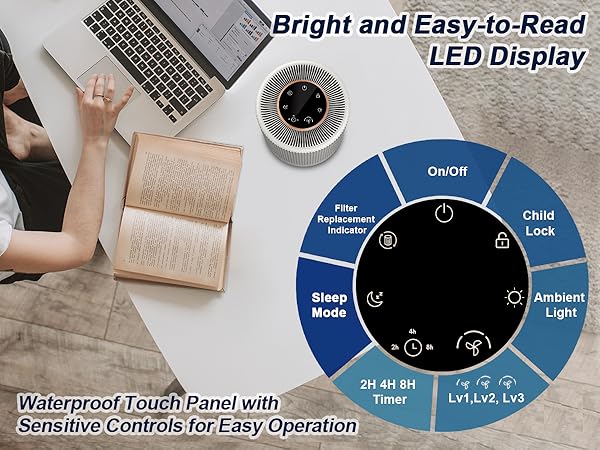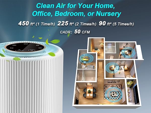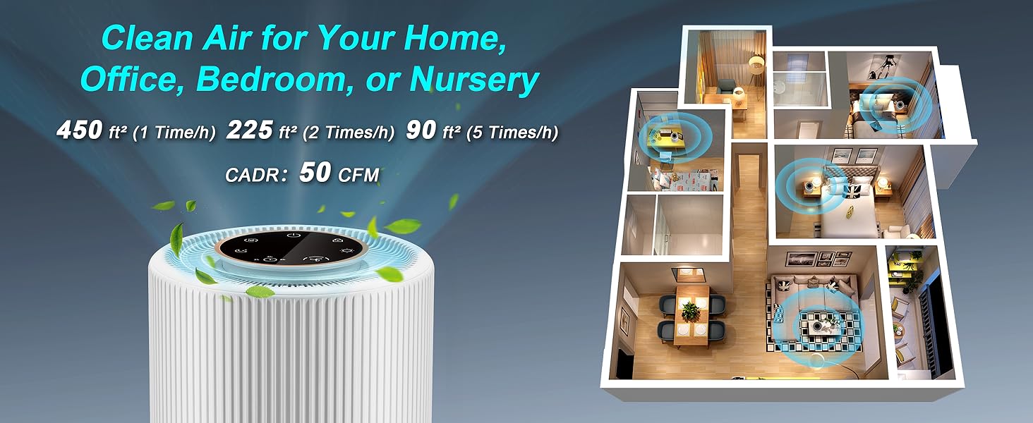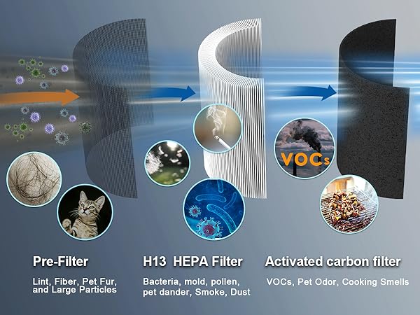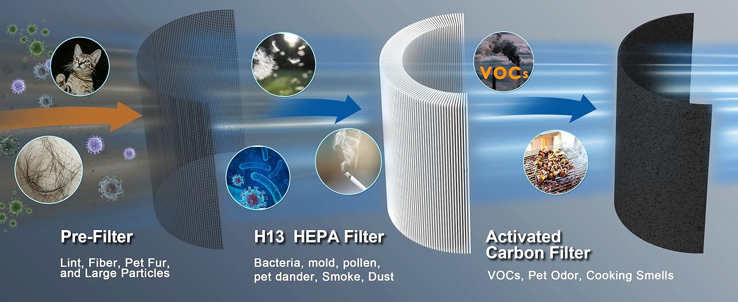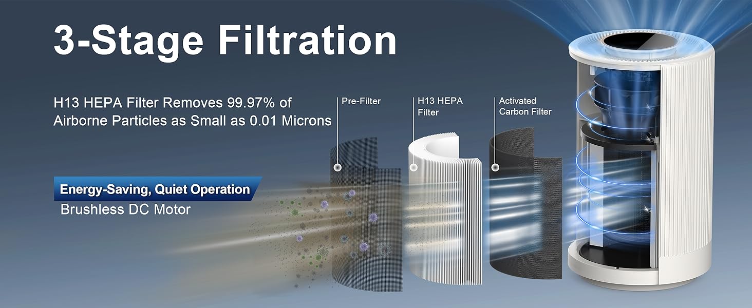 - 🌬️ Powerful HEPA Filtration: Covers up to 450 sq. ft. with a 3-stage system (pre-filter, True HEPA H13, activated carbon) removing 99.97% of dust, allergens, odors, and VOCs.